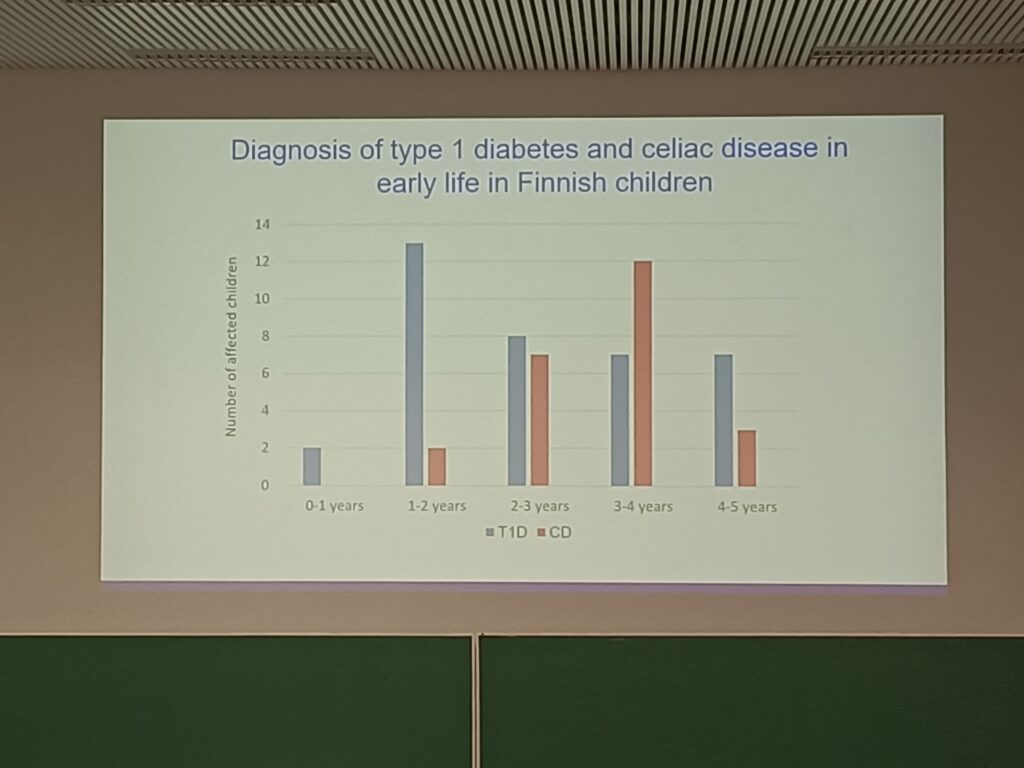 Por su parte, Mikael Knip (Universidad de Helsinki, Finlandia) explicó cómo los estudios combinados de EC y diabetes tipo 1 han mostrado que los bebés con la combinación de riesgo HLA DR4-DQ8 presentan marcadores de autoinmunidad a edades muy tempranas (1-2 años), concretamente autoanticuerpos anti-insulina, mientras que los que presentan la combinación HLA DR3-DQ2 tardan más en mostrar rasgos de autoinmunidad, en este caso anticuerpos anti-GAD. Estos datos muestran que el proceso autoinmune que conducirá finalmente a una diabetes tipo 1 se inicia muy pronto, mientras que la manifestación clínica de la enfermedad llega más tarde, a los 8 años de edad como media. Y aquellos pacientes en los que coexiste la diabetes tipo 1 con la EC, ésta se manifiesta en promedio 6 meses después de que se haya manifestado la diabetes.