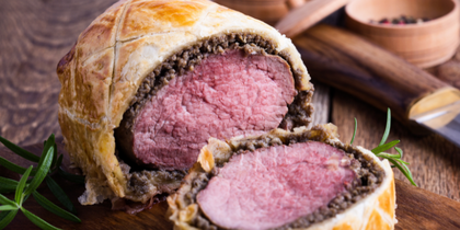 Plato principal de Navidad, donde el hojaldre recubre un solomillo jugoso.