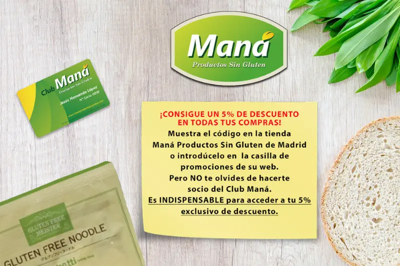 A partir de ahora, por ser socio de la Asociación, tendrás un 5% de descuento en tus compras en Maná. Bastará con que presentes esta promoción y tu carnet de socio (recuerda que lo tienes en la APP sinGLU10).