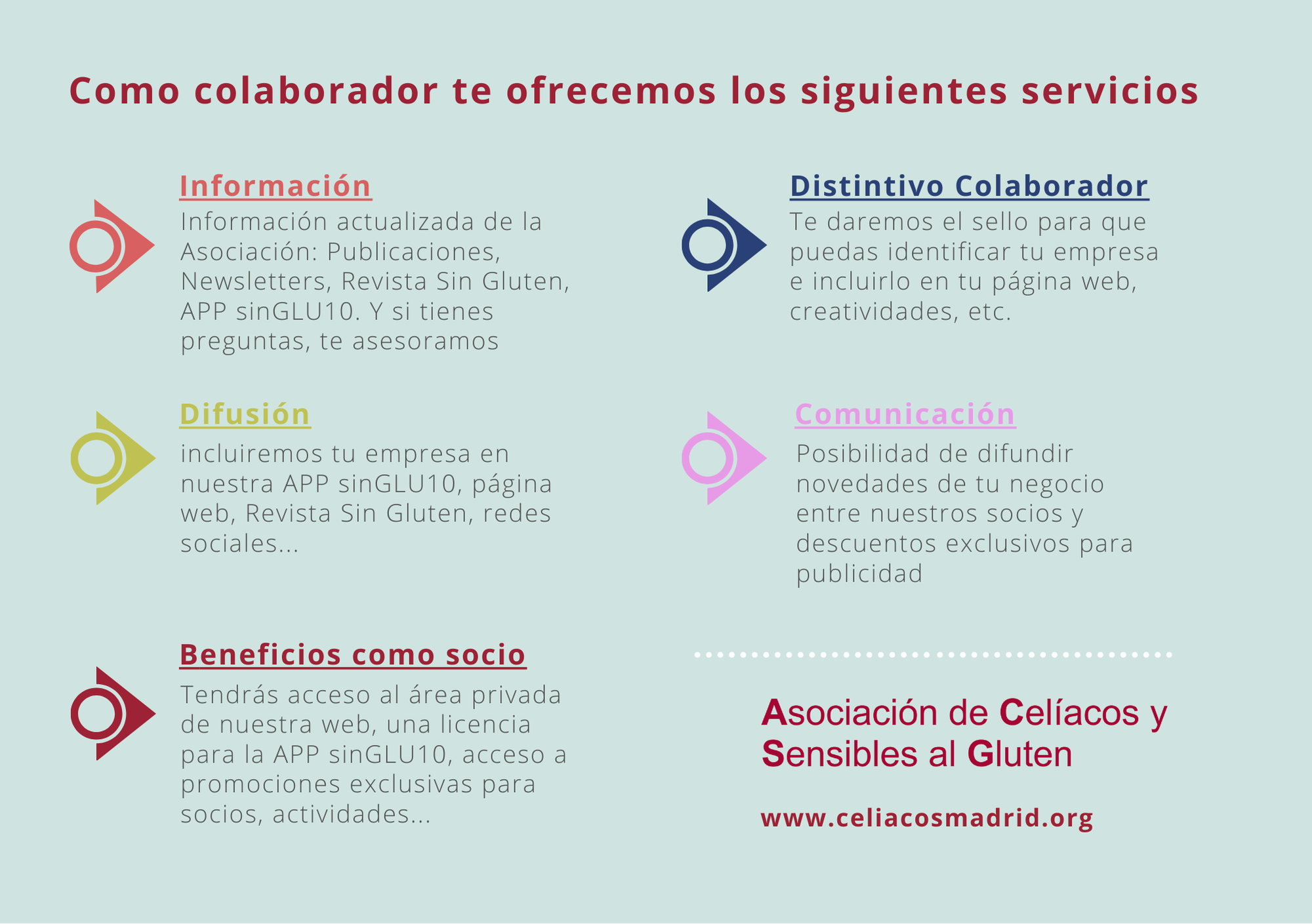 • Información actualizada: Lista de Productos Sin gluten (anual), Revista Sin Gluten (trimestral), Newsletter para colaboradores, etc.